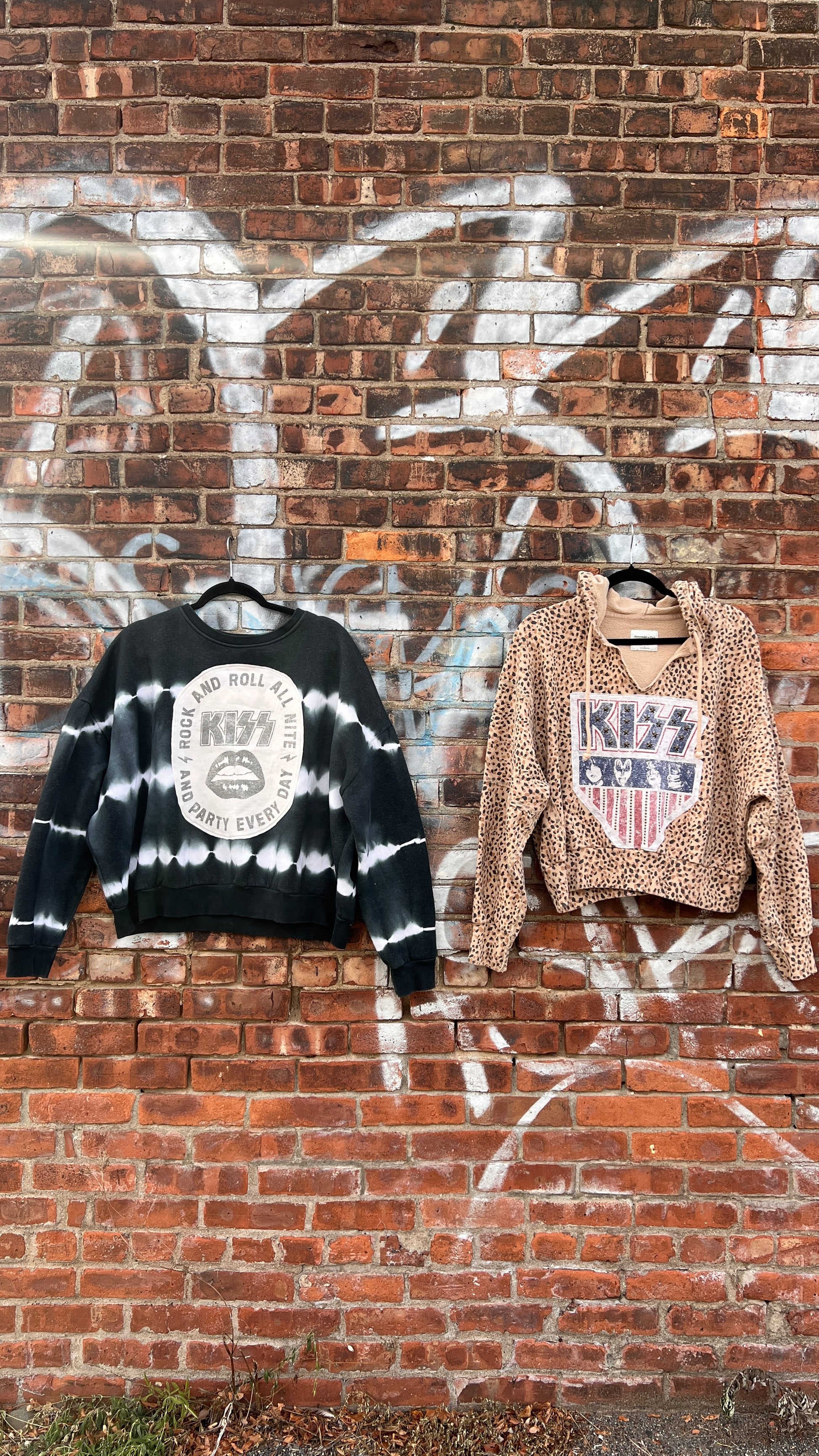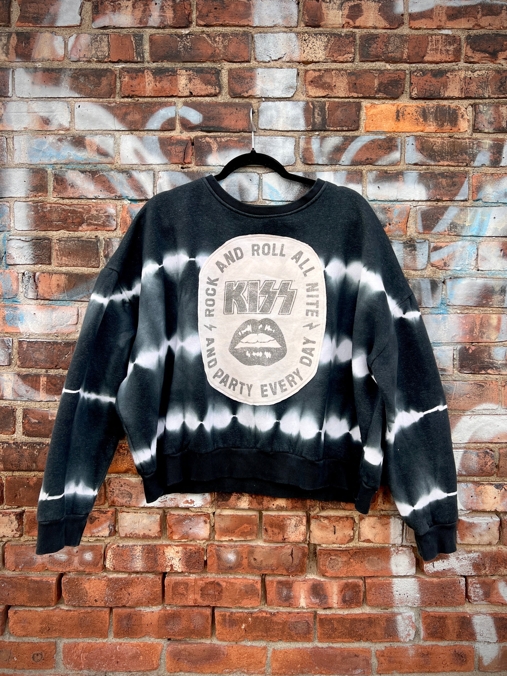 Tie dye medium weight modern crewneck sweatshirt reworked with a KISS tee cut up and sewn to make this one of a kind piece!