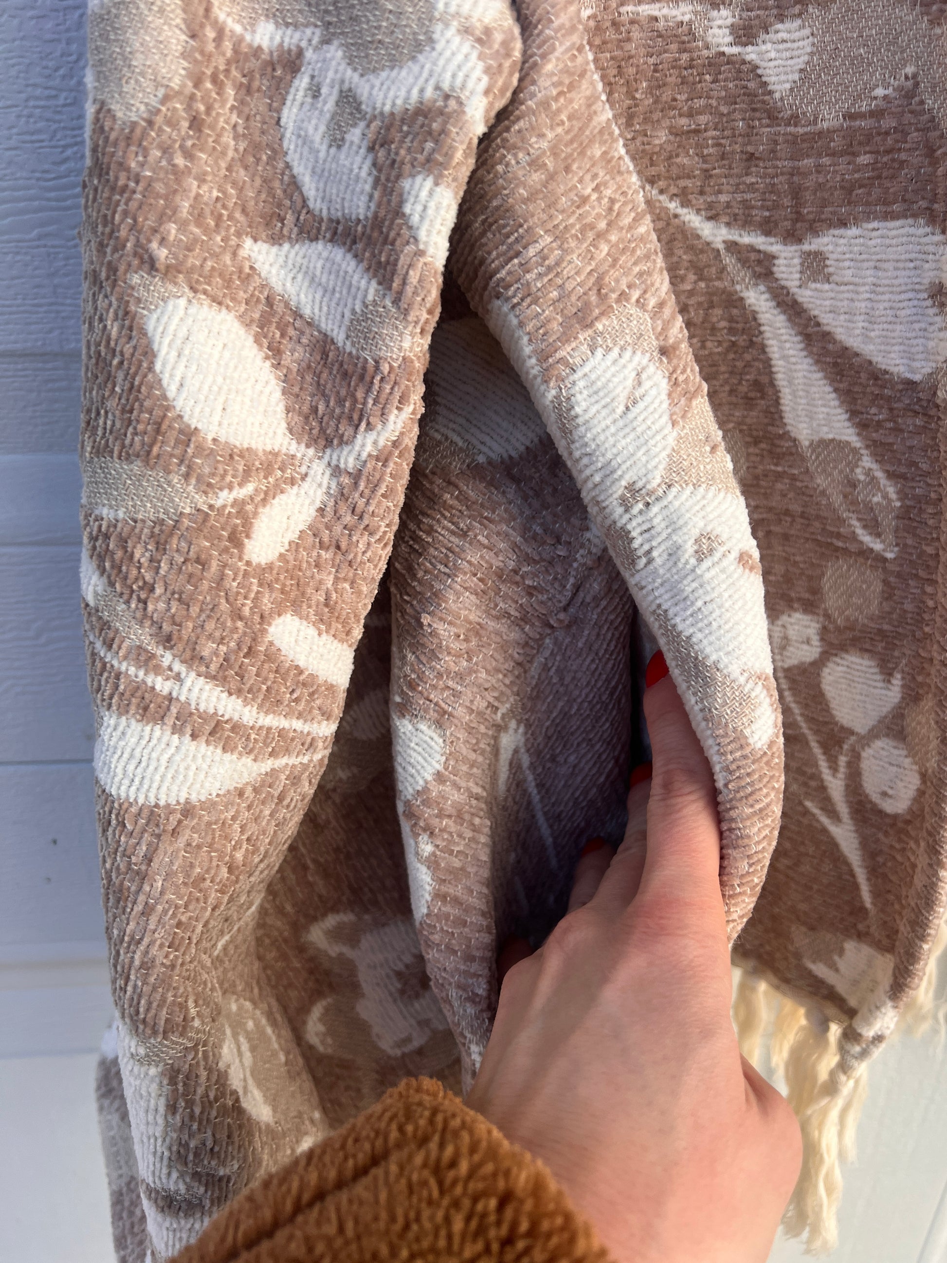 Medium weight super soft chenille floral printed woven fringe blanket reworked into a kimono style cardigan with bell sleeves. Open closure. Side pockets!